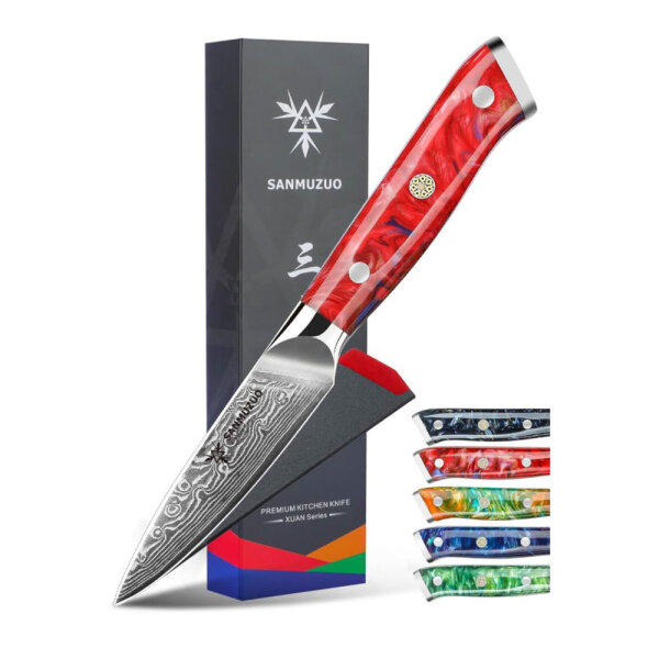 SANMUZUO Schälmesser 9 cm - Japanisches Officemesser - VG 10 Damaskus Stahl - Harzgriff in Sonnenuntergang Rot - ideal für Obst und Gemüse.