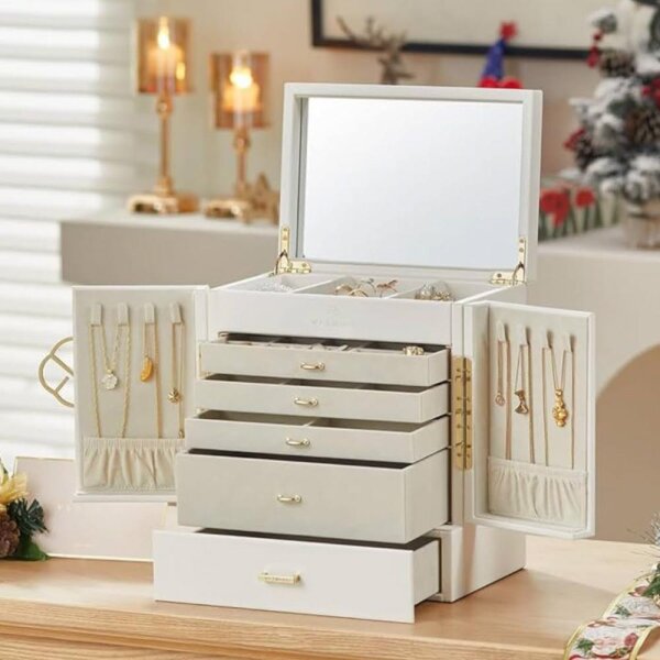 Vlando large jewelry box, French jewelry box 6 levels, jewelry organizers large XXL with mirror, drawers, jewelry storage for women, jewelry box for earrings, necklaces, watches